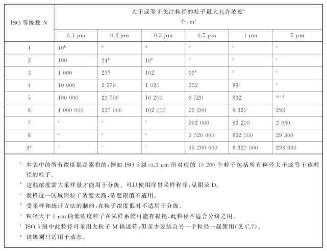 表中所有濃度都是累積濃度,例如ISO5.5 級(jí),0.5μm 粒徑的11100 顆中,包括所有粒徑大于或等于該粒徑的粒子。